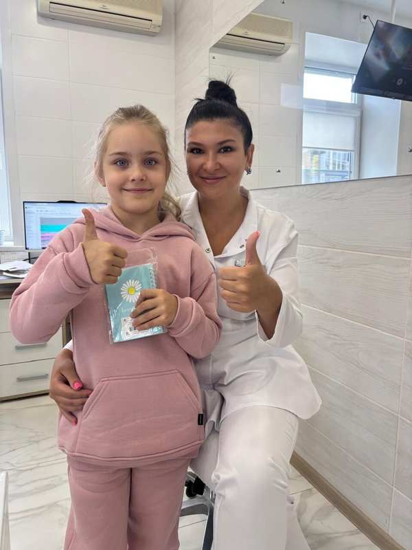 Дочь не испугалась, была рада подарочку, врач хорошо отнеслась к ней, по-доброму все расспросила, как зовут и сколько лет, расположила к себе. Мы обратились, чтобы зубки полечить. На данном этапе была поставлена временная пломба, в следующий раз ее заменят на постоянную. Мы первый раз посетили клинику.